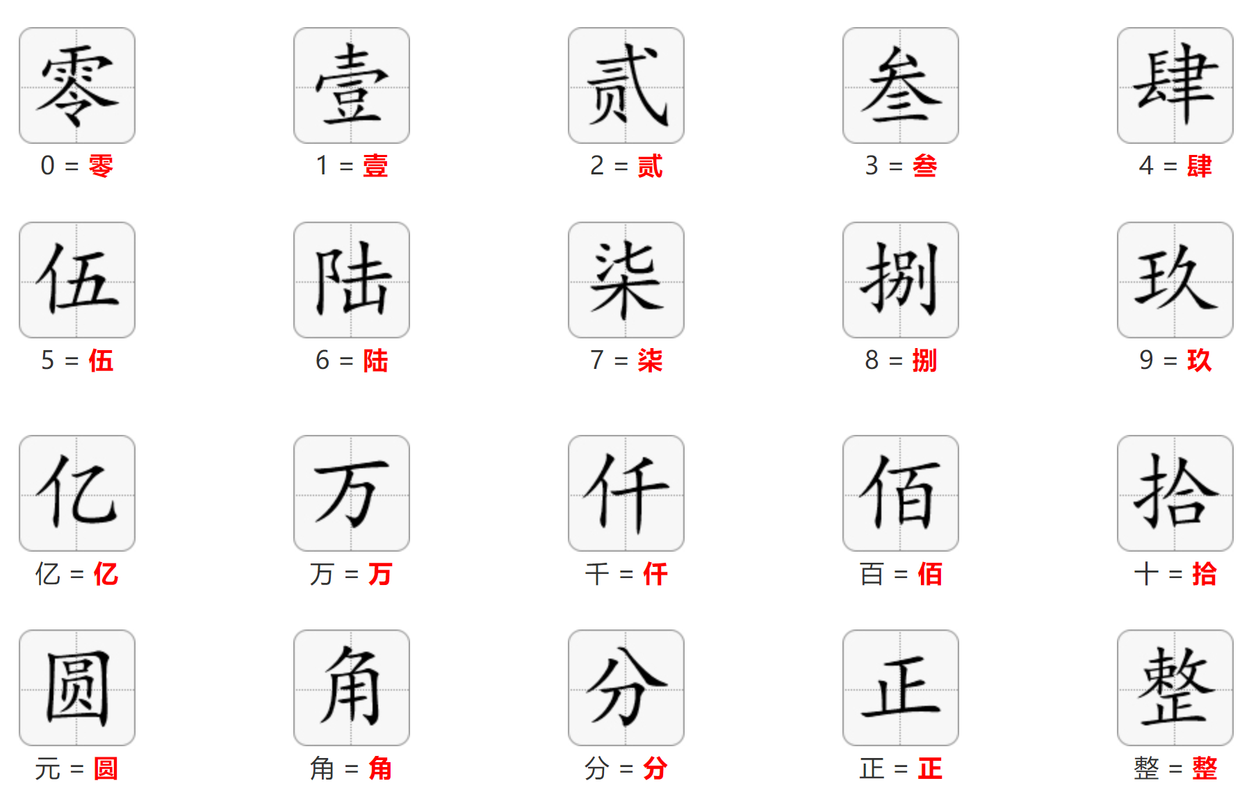 零、壹、贰、叁、肆、伍、陆、柒、捌、玖、拾、佰、仟、万、亿。